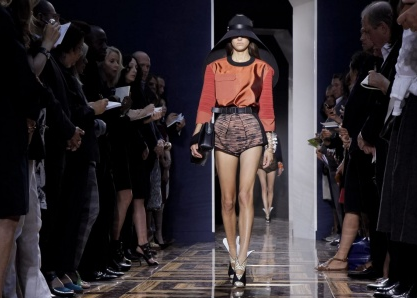 This season Nicolas Ghesquiere – who has been at the creative helm of Balenciaga since 1997 - worked with beautiful printed shirts, broad shoulders on suede dresses and vests and high-waisted trousers made from different fabrics – so denim at the front and twill at the back. Legs were narrow on the trouser front and with belts woven through the waist, while mini shorts were cut high on the leg and worked to build up the boxier jacket shapes above.